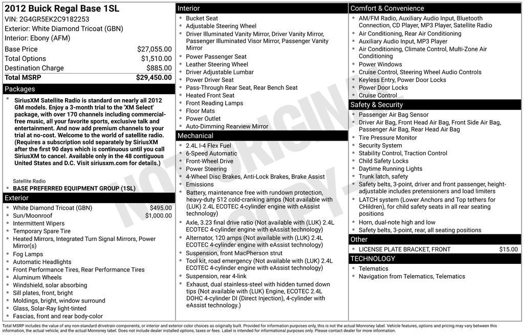 This 2012 Buick Regal Base offers an exceptional blend of style, performance, and value. With its sleek exterior, spacious interior, and impressive array of features, this vehicle is an exceptional choice for the discerning driver.
