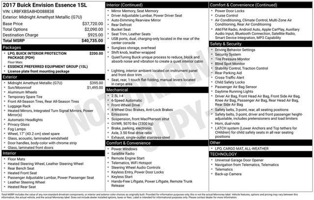 18 10-Spoke Polished Aluminum Wheels, 3.50 Final Drive Axle Ratio, 4-Wheel Disc Brakes, 6 Speakers, 6-Speaker Audio System Feature, ABS brakes, Air Conditioning, All-Weather Cargo Mat (LPO), All-Weather Floor Mats, Alloy wheels, AM/FM radio: SiriusXM, Apple CarPlay/Android Auto, Auto-dimming door mirrors, Auto-dimming Rear-View mirror, Automatic temperature control, Brake assist, Buick Interior Protection Package (LPO), Bumpers: body-color, Compass, Delay-off headlights, Driver 8-Way Power Seat Adjuster, Driver door bin, Driver vanity mirror, Dual front impact airbags, Dual front side impact airbags, Electronic Stability Control, Emergency communication system: OnStar Guidance, Exterior Parking Camera Rear, Four wheel independent suspension, Front anti-roll bar, Front Bucket Seats, Front Center Armrest, Front dual zone A/C, Front fog lights, Front Passenger 8-Way Power Seat Adjuster, Front reading lights, Fully automatic headlights, Garage door transmitter, Heated door mirrors, Heated Driver & Front Passenger Seats, Heated front seats, Heated rear seats, Heated steering wheel, Illuminated entry, Knee airbag, Low tire pressure warning, Memory seat, Occupant sensing airbag, Outside temperature display, Overhead airbag, Overhead console, Panic alarm, Passenger door bin, Passenger vanity mirror, Perforated Leather-Appointed Seat Trim, Power door mirrors, Power driver seat, Power Liftgate, Power Panoramic Tilt-Sliding Moonroof, Power passenger seat, Power steering, Power windows, Preferred Equipment Group 1SL, Premium audio system: IntelliLink, Radio data system, Radio: Buick IntelliLink AM/FM Stereo, Rear air conditioning, Rear anti-roll bar, Rear Parking Sensors, Rear reading lights, Rear seat center armrest, Rear side impact airbag, Rear window defroster, Rear window wiper, Remote keyless entry, Roof rack: rails only, Security system, SiriusXM Satellite Radio, Speed control, Speed-sensing steering, Split folding rear seat, Spoiler, Steering wheel mounted audio controls, Tachometer, Telescoping steering wheel, Tilt steering wheel, Traction control, Trip computer, Turn signal indicator mirrors, Variably intermittent wipers. 2017 Buick Envision Clean CARFAX.