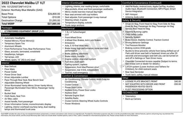 17 Aluminum Wheels, 4-Wheel Disc Brakes, 6 Speakers, 6-Speaker Audio System Feature, 6-Way Manual Front Passenger Seat Adjuster, 8-Way Power Driver Seat Adjuster, ABS brakes, Air Conditioning, Alloy wheels, AM/FM radio: SiriusXM, Automatic temperature control, Brake assist, Bumpers: body-color, Compass, Delay-off headlights, Driver door bin, Driver vanity mirror, Dual front impact airbags, Dual front side impact airbags, Electronic Stability Control, Emergency communication system: OnStar and Chevrolet connected services capable, Exterior Parking Camera Rear, Four wheel independent suspension, Front anti-roll bar, Front Bucket Seats, Front Center Armrest, Front dual zone A/C, Front License Plate Bracket, Front reading lights, Fully automatic headlights, Heated door mirrors, Heated front seats, Illuminated entry, Knee airbag, Low tire pressure warning, Not Equipped w/Driver & Fr Passenger Heated Seats, Occupant sensing airbag, Outside temperature display, Overhead airbag, Overhead console, Panic alarm, Passenger door bin, Passenger vanity mirror, Power door mirrors, Power Driver Lumbar Control Seat Adjuster, Power driver seat, Power steering, Power windows, Preferred Equipment Group 1LT, Premium audio system: Chevrolet Infotainment 3 Plus, Premium Cloth Seat Trim, Radio data system, Radio: Chevrolet Infotainment 3 System, Rear anti-roll bar, Rear reading lights, Rear seat center armrest, Rear side impact airbag, Rear window defroster, Remote keyless entry, Security system, SiriusXM Radio, Speed control, Split folding rear seat, Steering wheel mounted audio controls, Tachometer, Telescoping steering wheel, Tilt steering wheel, Traction control, Trip computer, Variably intermittent wipers, Voltmeter, Wireless Apple CarPlay/Android Auto. 2022 Chevrolet Malibu