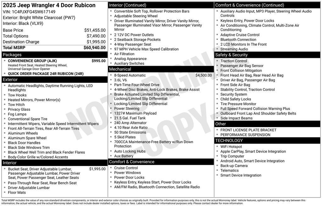 4-Wheel Disc Brakes, 4.10 Rear Axle Ratio, 4G LTE Wi-Fi Hot Spot, 8 Speakers, 97 MPH Vehicle Max Speed Calibration, ABS brakes, Air Conditioning, Alloy wheels, AM/FM radio: SiriusXM, Apple CarPlay, Apple CarPlay/Android Auto, Automatic temperature control, Aux Battery, Auxiliary Switches, Brake assist, Class II Receiver Hitch, Cloth Low-Back Bucket Seats, Compass, Connectivity - US/Canada, Convenience Group, Delay-off headlights, Driver door bin, Driver vanity mirror, Dual front impact airbags, Dual front side impact airbags, Electronic Stability Control, Emergency communication system: Jeep Connect, Front anti-roll bar, Front Bucket Seats, Front Center Armrest w/Storage, Front dual zone A/C, Front fog lights, Front License Plate Bracket (DISC), Front reading lights, Fully automatic headlights, Google Android Auto, Heated door mirrors, Heated Front Seats, Heated Steering Wheel, Illuminated entry, Integrated roll-over protection, Low tire pressure warning, Non-Lock Fuel Cap w/o Discriminator, Occupant sensing airbag, Outside temperature display, Overhead airbag, Panic alarm, ParkView Rear Back-Up Camera, Passenger door bin, Passenger vanity mirror, Performance Suspension, Power door mirrors, Power steering, Power windows, Quick Order Package 24R Rubicon, Radio data system, Radio: Uconnect 5 w/12.3 Display, Rear anti-roll bar, Rear reading lights, Remote keyless entry, Security system, Speed control, Split folding rear seat, Steering wheel mounted audio controls, Stop-Start Dual Battery System, Tachometer, Telescoping steering wheel, Tilt steering wheel, Traction control, Trip computer, Universal Garage Door Opener, Variably intermittent wipers, Voltmeter, Wheels: 17 x 7.5 Machined/Painted Black. 2025 Jeep Wrangler CARFAX One-Owner. Clean CARFAX.